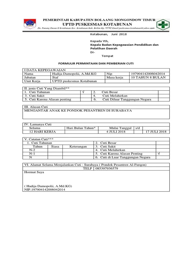 Contoh surat izin cuti sakit docx size 13 kb contoh via pusatsurat.blogspot.com. Aug 24, 2016 · hak cuti di luar tanggungan ini juga bisa digunakan oleh karyawan yang baru bergabung dan perlu mengambil cuti, tetapi ia belum punya jatah cuti. Prosedur operasional baku cuti pns. Mar 28, 2016 · contoh surat permintaan cuti diluar tanggungan negara.docx sampai disini kiranya berbagi file pada kesempatan kali ini, semoga bisa berguna serta bermanfaat untuk sekarang ataupun yang akan datang. Institut pertanian bogor, direktorat sumberdaya manusia. Contoh surat masuk penawaran kerjasama. Prosedur ini bertujuan untuk memberikan prosedur tentang pelayanan cuti kepada tenaga pendidik (dosen) maupun tenaga kependidikan berstatus pegawai negeri sipil (pns) yang berhak menerimanya. Apakah cuti di luar tanggungan negara? Anda juga bisa melihat file lainnya seperti contoh surat home visit untuk bk atau wali kelas. Berikut contoh surat keputusan cltn: Siapa pns yang selesai menjalankan cuti di luar tanggungan negara? Pns yang telah bekerja paling singkat 5 (lima) tahun secara terus menerus karena alasan pribadi dan mendesak dapat diberikan cuti diluar tanggungan negara; Jul 21, 2017 · cuti di luar tanggungan negara (perka bkn no.